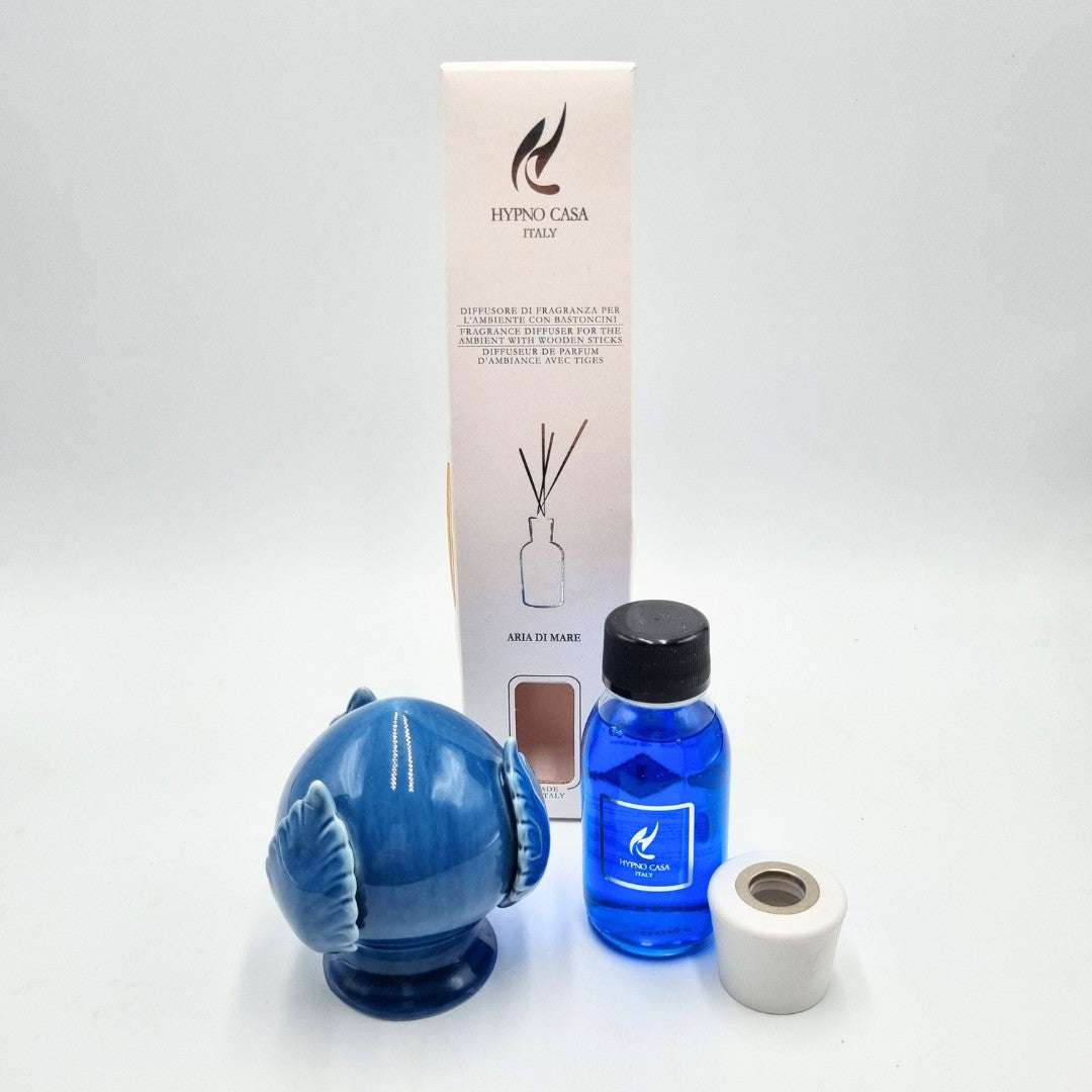€20,00€20,00 €23,00/Set composto da: pomo pugliese blu in ceramica (9 cm); profumatore (100ml) "Aria di mare" bottiglia in vetro e tappo in legno;