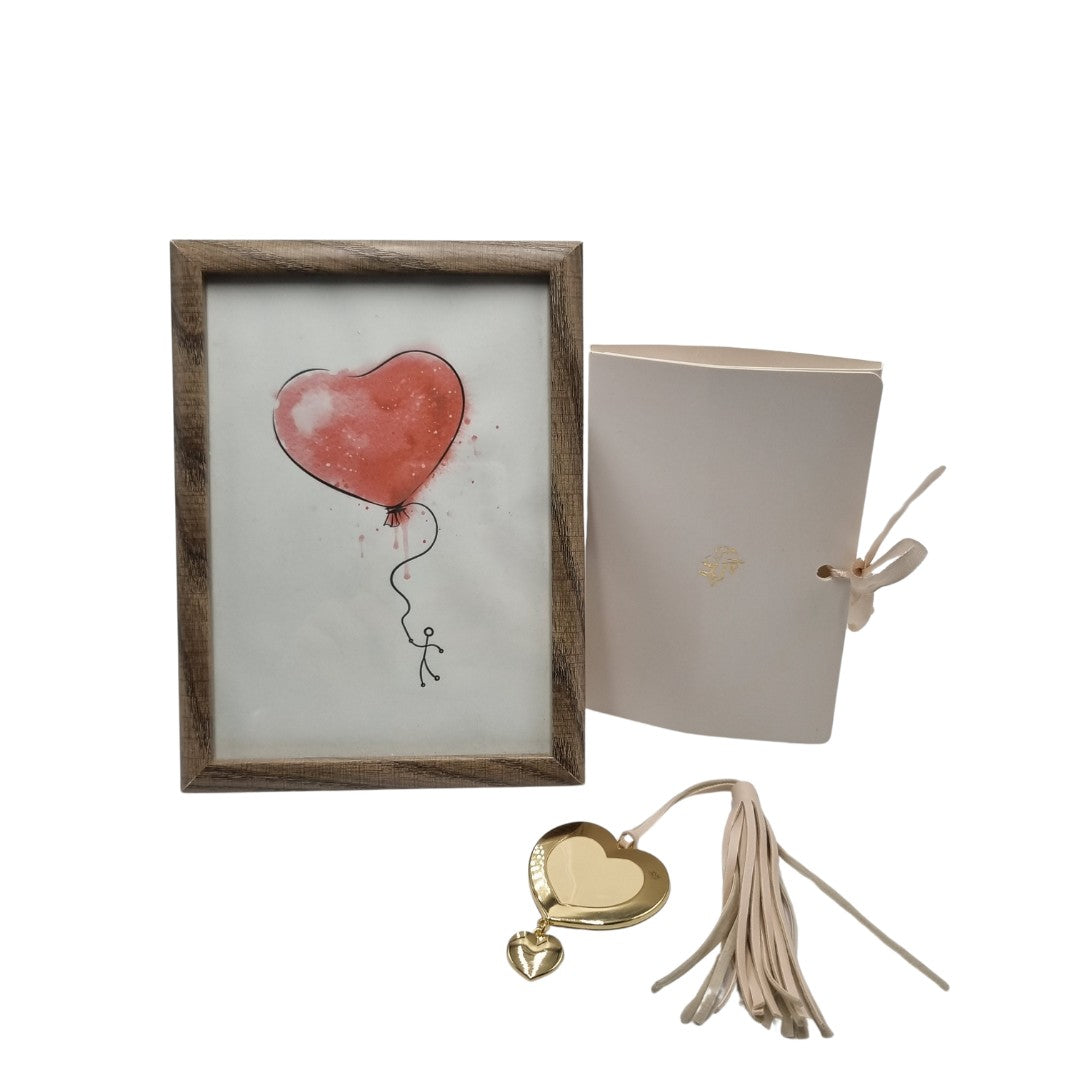 €18,00€18,00/Portafoto in legno con stampa palloncino a cuore e segnalibro in metallo a forma di cuore con nappina in ecopelle. Dimensioni cornice: 19 x 14 cm;...