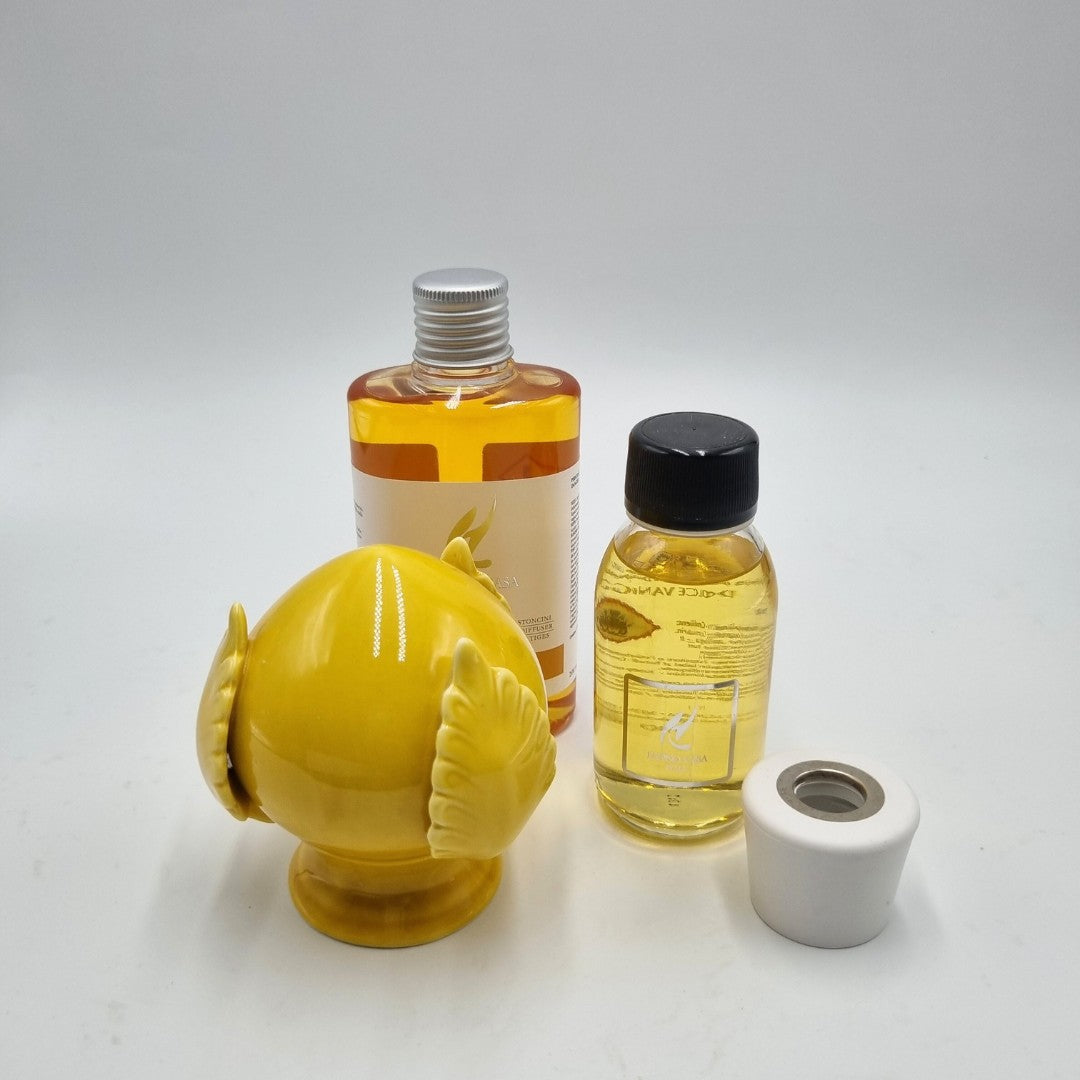 €30,00€30,00 €36,00/Set composto da: pomo pugliese giallo in ceramica (9 cm); profumatore (100ml) "Dolce vaniglia" bottiglia in vetro e tappo in legno; ricarica (200ml).