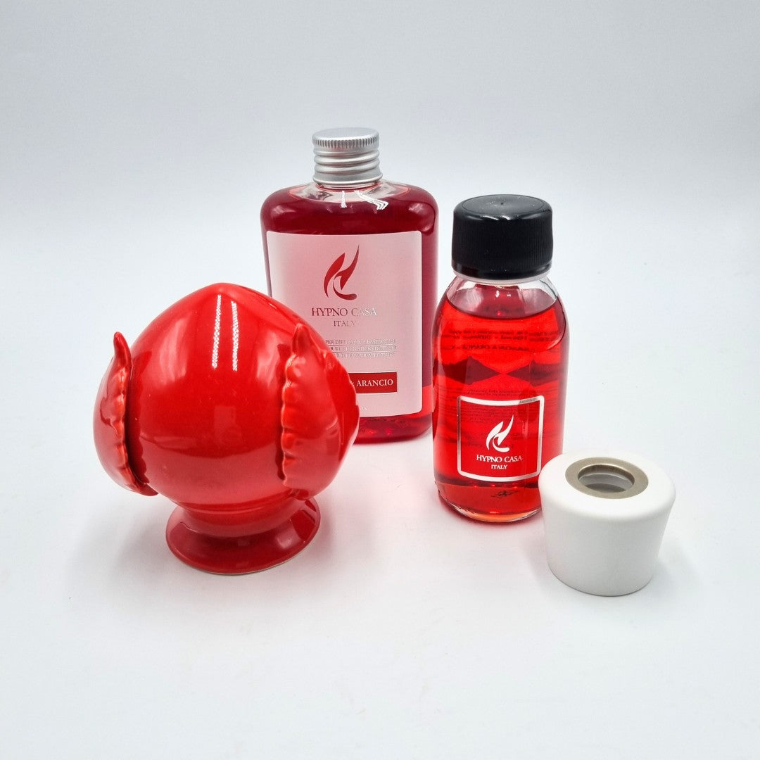 €30,00€30,00 €36,00/Set composto da: pomo pugliese rosso in ceramica (9 cm); profumatore (100ml) "Cannella e arancia" bottiglia in vetro e tappo in legno; ricarica (200ml).