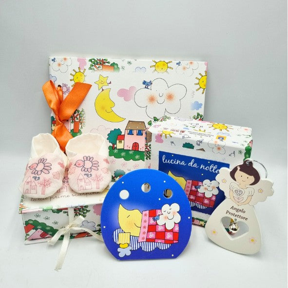 €29,00€29,00 €58,00/Set regali "Nuvoletta Olga" da maschietto, composto da: scarpine portafortuna (con scatola); angioletto della serenità in legno con campanellina; luce da notte in legno (con scatola)...